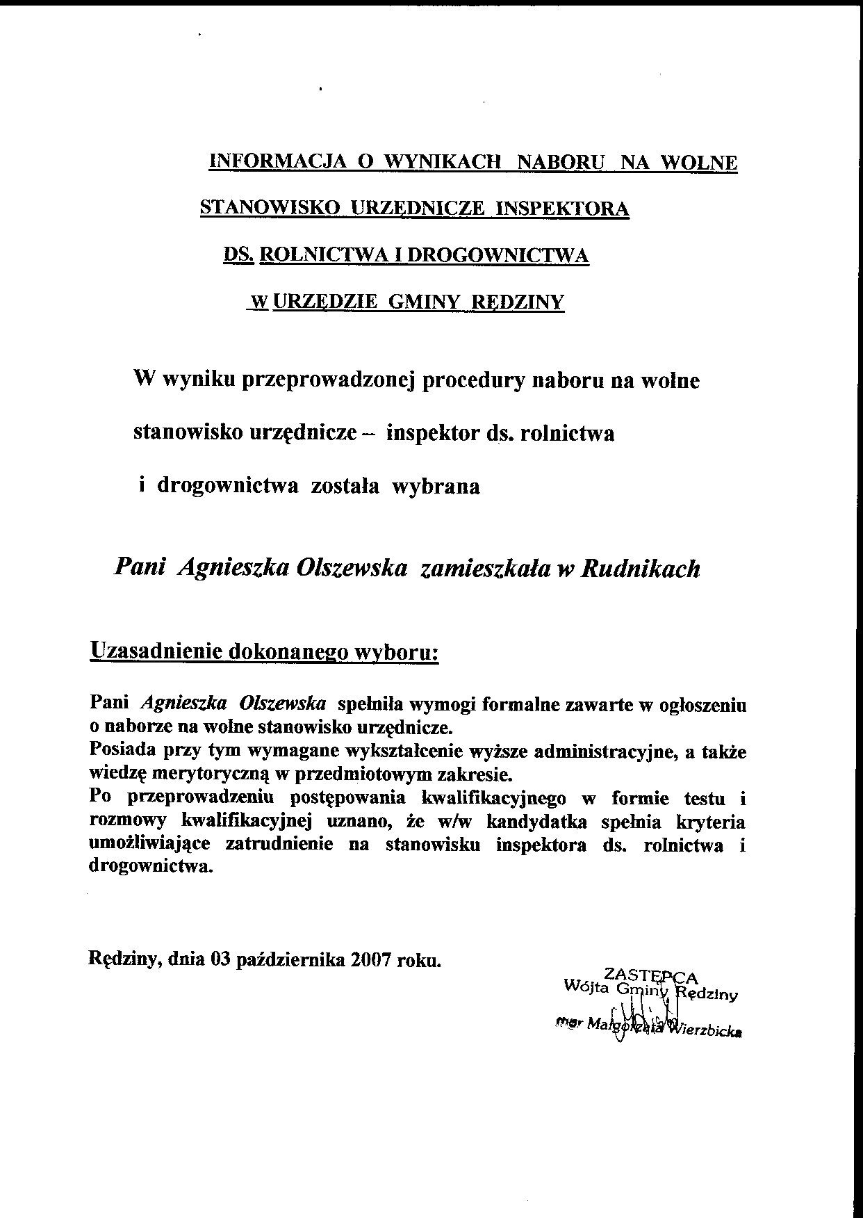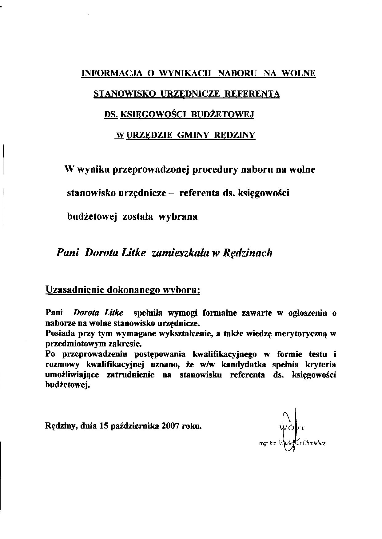 Informacja o wynikach naboru na wolne stanowisko urzędnicze informatyk w Urzędzie Gminy Rędzinyinformacja o wynikach naboru.doc |