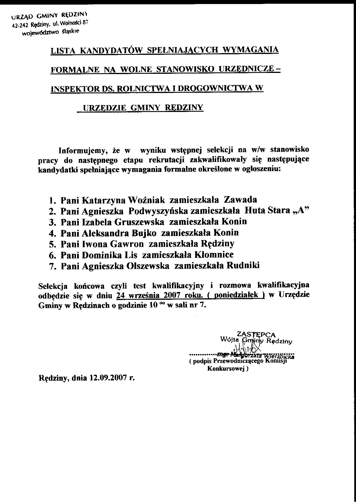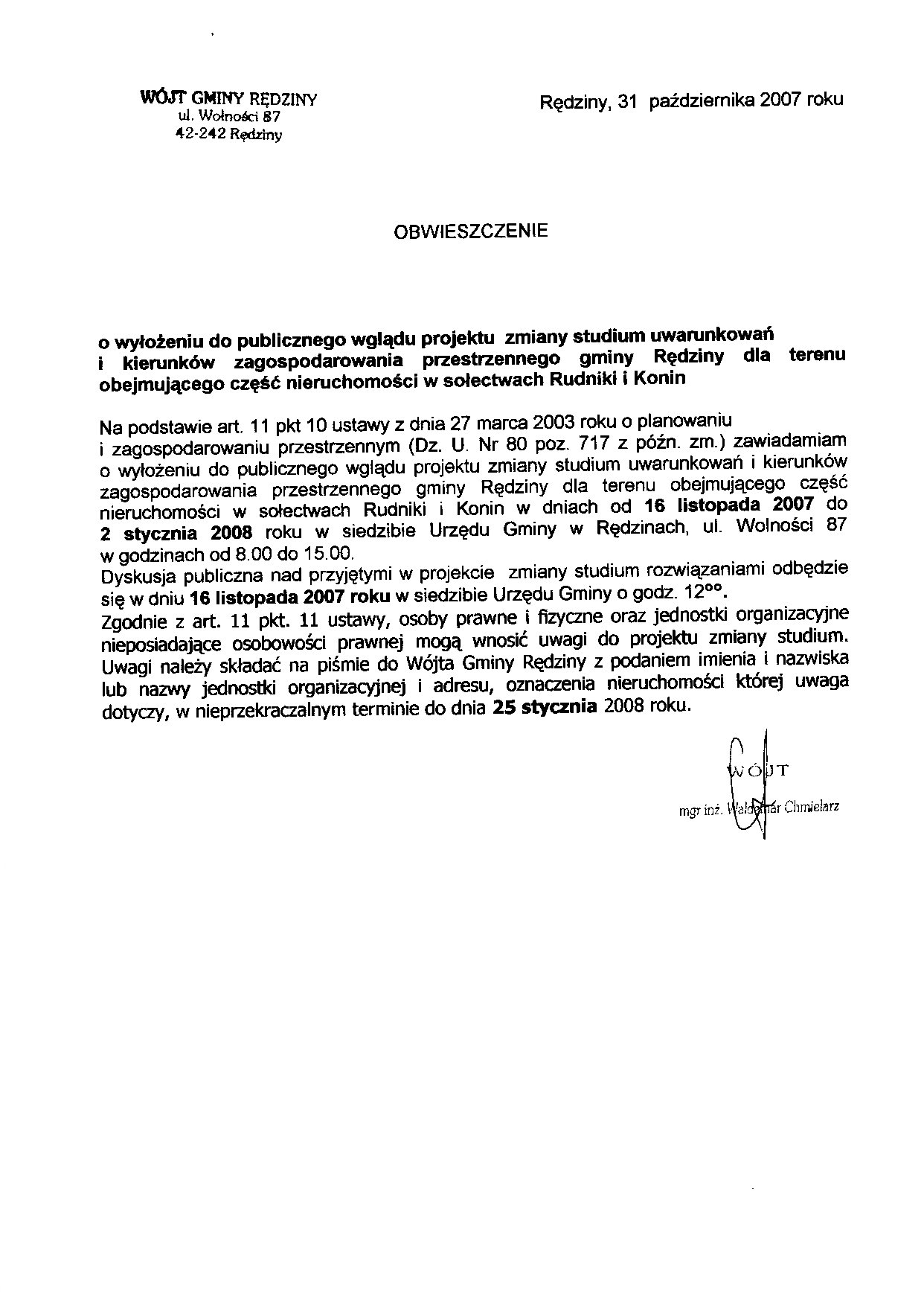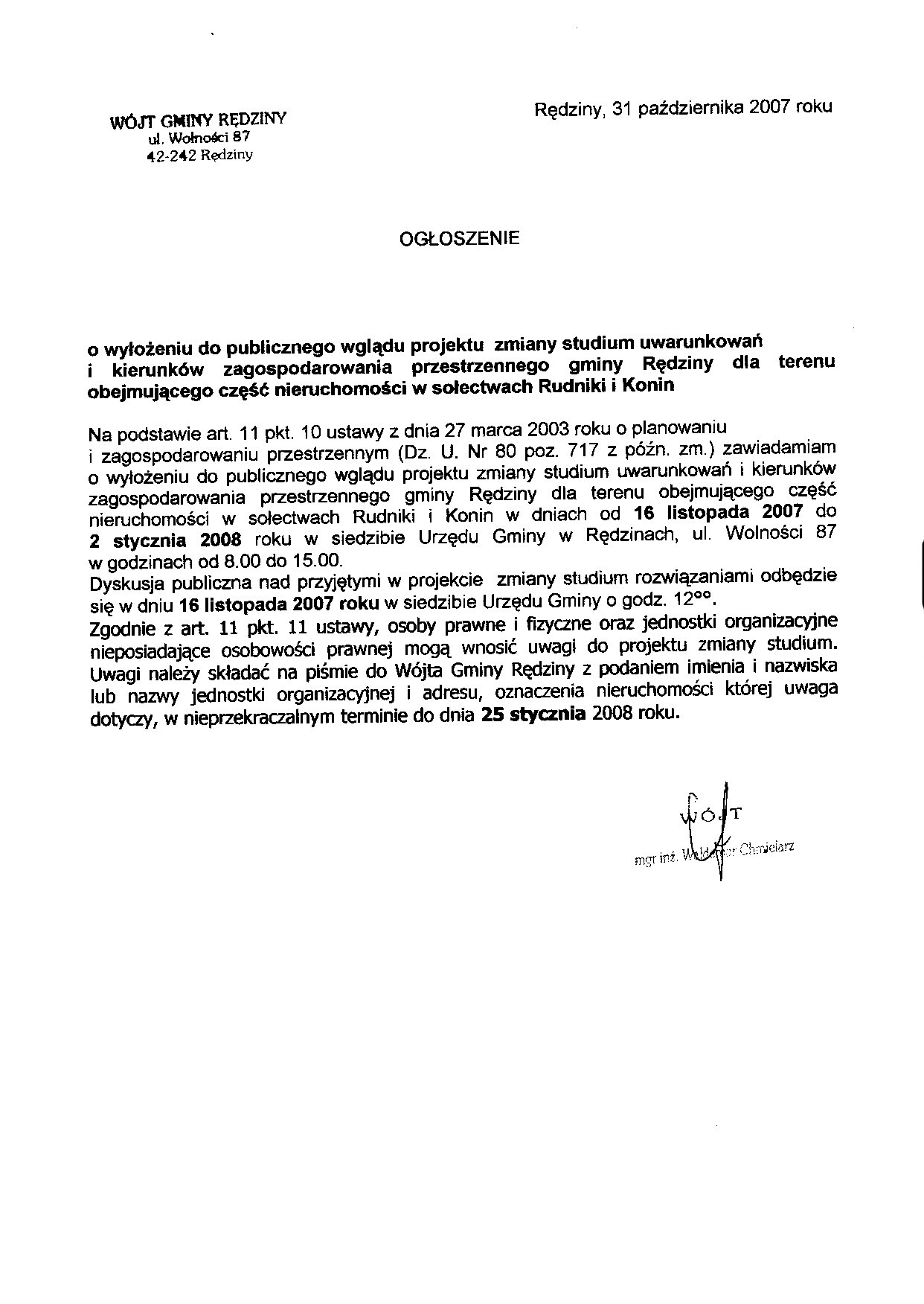 | Obwieszczenie Wójta Gminy Rędziny z dnia 20.06.2007 |
