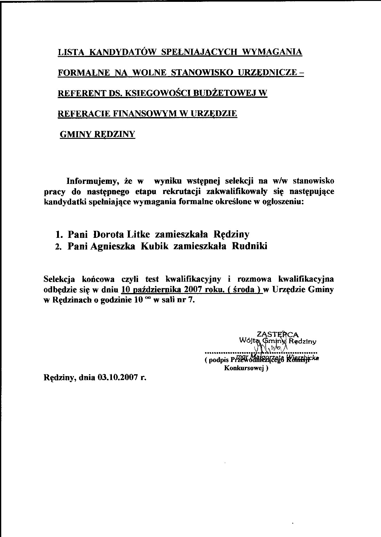Wójt Gminy Rędziny ogłasza nabór na wolne stanowisko urzędnicze - referenta ds. księgowości budżetowej w Referacie Finansowym konkurs29.08.2007.pdf |